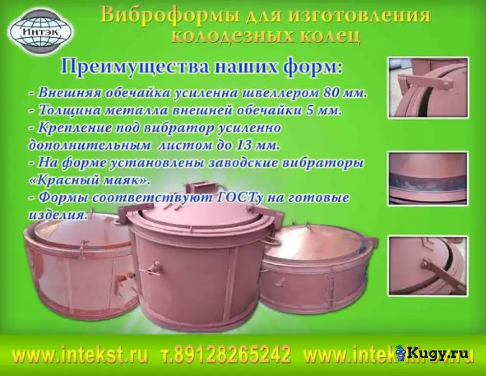 Группа предприятий ООО «Интэк» производит и реализует металлические формы для производства колодезных колец КС-7.9; КС-10.9; КС-15.9; КС-20.9, а так же формы для крышек и днищ колодцев (ПП-10; 1ПП-15; 1ПП-20). По желанию заказчика наш завод может изготовить формы под любой другой размер. При покупке металлической формы, технология производства колодезных колец предоставляется бесплатно.Качество, гарантия, низкие цены, сервис-все это сочетается в одном слове-«Интэк» У наших сотрудников вы можете получить исчерпывающие ответы на все ваши вопросы.8 8332 247 333